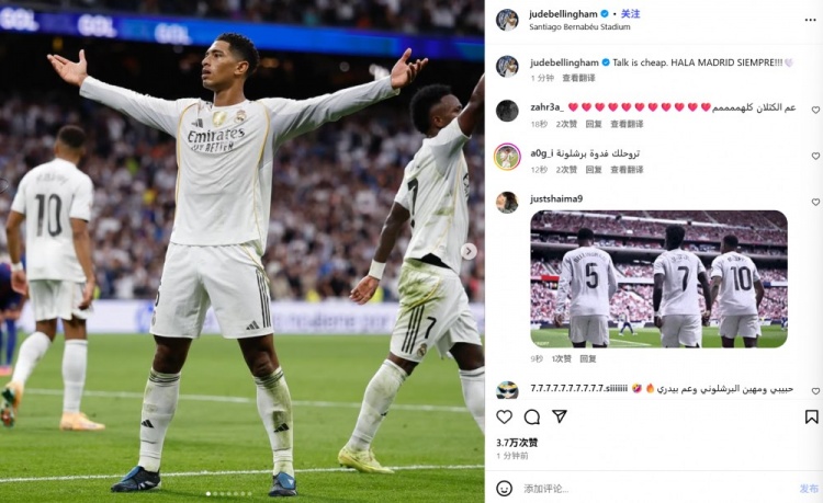 亚马尔的言论被皇马球员视为“宣战”,更衣室内不会忽视这一点,以贝林厄姆为例,他在赛后晒照并发文“空谈是廉价的,永远支持皇马”。